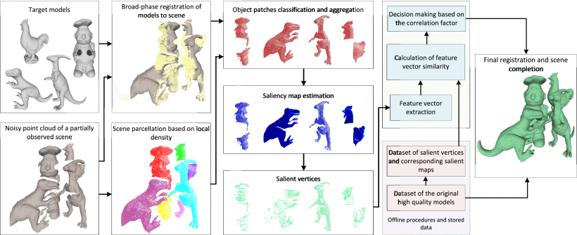 The new generation 3D scanner devices have revolutionized the way information from 3D objects is acquired, making the process of scene capturing and digitization straightforward. However, the effectiveness and robustness of conventional algorithms for real scene analysis are usually deteriorated due to challenging conditions, such as noise, low resolution, and bad perceptual quality. In this work, we present a methodology for identifying and registering partially-scanned and noisy 3D objects, lying in arbitrary positions in a 3D scene, with corresponding high-quality models. The methodology is assessed on point cloud scenes with multiple objects with large missing parts. The proposed approach does not require connectivity information and is thus generic and computationally efficient, thereby facilitating computationally demanding applications, like augmented reality. The main contributions of this work are the introduction of a layered joint registration and indexing scheme of cluttered partial point clouds using a novel multi-scale saliency extraction technique to identify distinctive regions, and an enhanced similarity criterion for object-to-model matching. The processing time of the process is also accelerated through 3D scene segmentation. Comparisons of the proposed methodology with other state-of-the-art approaches highlight its superiority under challenging conditions.