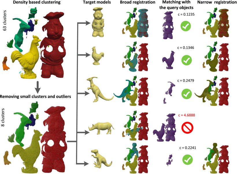 Broad-to-Narrow Registration and Identification of 3D Objects in Partially Scanned and Cluttered Point Clouds