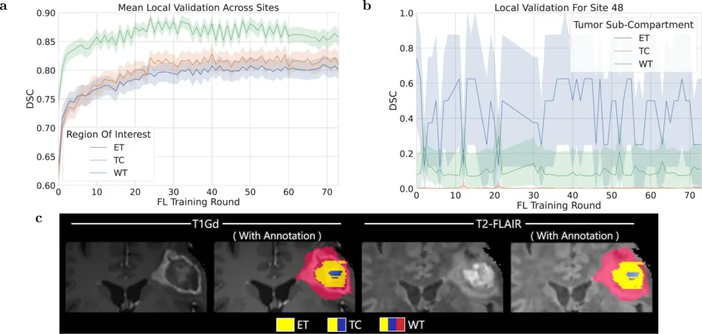 Although machine learning (ML) has shown promise across disciplines, out-of-sample generalizability is concerning. This is currently addressed by sharing multi-site data, but such centralization is challenging/infeasible to scale due to various limitations. Federated ML (FL) provides an alternative paradigm for accurate and generalizable ML, by only sharing numerical model updates. Here we present the largest FL study to-date, involving data from 71 sites across 6 continents, to generate an automatic tumor boundary detector for the rare disease of glioblastoma, reporting the largest such dataset in the literature (n = 6, 314). We demonstrate a 33% delineation improvement for the surgically targetable tumor, and 23% for the complete tumor extent, over a publicly trained model. We anticipate our study to: 1) enable more healthcare studies informed by large diverse data, ensuring meaningful results for rare diseases and underrepresented populations, 2) facilitate further analyses for glioblastoma by releasing our consensus model, and 3) demonstrate the FL effectiveness at such scale and task-complexity as a paradigm shift for multi-site collaborations, alleviating the need for data-sharing. Federated ML (FL) provides an alternative to train accurate and generalizable ML models, by only sharing numerical model updates. Here, the authors present the largest FL study to-date to generate an automatic tumor boundary detector for glioblastoma.